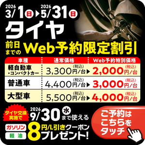 たくさんのご予約ありがとうございます🙇♂️✨現在、タイヤ交換キャンペーン大好評受付中です‼️📅 3/1 ▶︎ 5/31前日までの【Web予約】でお得にタイヤ交換できます😆✨🔹軽・コンパクト ▶︎ 2,000円🔹普通車 ▶︎ 3,000円🔹大型車 ▶︎ 4,000円作業後は立ち会いでの確認も実施👌✨仕上がりを一緒にチェックできるので安心してご利用いただけます😊🚗さらに‼️⛽ガソリン・軽油 8円/L引きクーポンもプレゼント🎁✨この機会にぜひご利用ください👍⚠️【重要なお知らせ】⚠️2026年3月1日より輸入車のピット作業受付を停止させていただいております。ご利用のお客様にはご不便・ご迷惑をおかけし大変申し訳ございません🙇♂️何卒ご理解のほどよろしくお願いいたします。#タイヤ交換#タイヤ履き替え#タイヤ脱着#タイヤ交換キャンペーン#タイヤ交換安い#タイヤ交換予約#Web予約限定#スタッドレス交換#ノーマルタイヤ交換#春タイヤ交換#履き替えシーズン#タイヤメンテナンス#ホイール脱着#空気圧チェック#タイヤ点検#長野市タイヤ交換#須坂市タイヤ交換