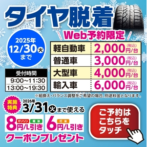🎉🔥 タイヤ脱着キャンペーン開催中‼️今なら WEB予約限定価格✨🚗軽2,000円〜🚙普通3,000円〜💨めっちゃお得にタイヤ交換できちゃう👏さらに‼️交換で⛽ガソリン【8円/L引き】🪣灯油【6円/L引き】クーポンプレゼント🎁📅12/30(火)まで⏰👉【今すぐ予約してお得GET!】👈#タイヤ交換 #冬支度 #キャンペーン #ガソリン割引