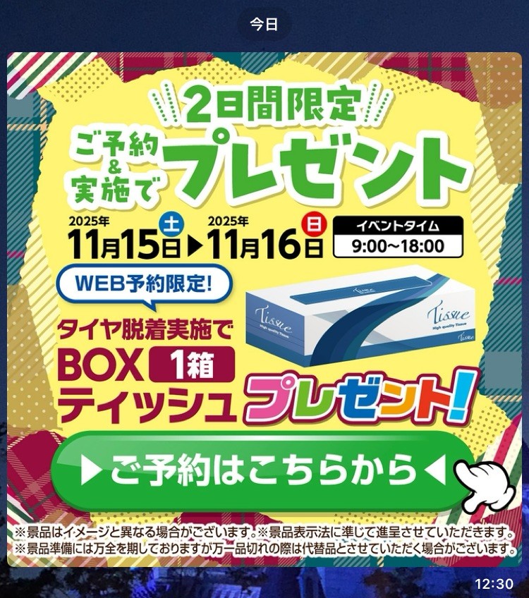🗓11/15(土)〜11/16(日)💫WEB予約でタイヤ脱着すると…🎁🎉✨BOXティッシュ1箱プレゼント✨🎉冬タイヤ準備の今がチャンス⛄️❄️お得に交換してプレゼントGETしちゃおう💖#ENEOSウイング #長野TS #タイヤ交換 #脱着キャンペーン#ティッシュプレゼント #WEB予約限定 #冬タイヤ準備 #車メンテ#お得情報 #ドライブ準備OK #キャンペーン中 #限定イベント#ENEOS #プレゼント企画 #カーライフ応援 #2日間限定