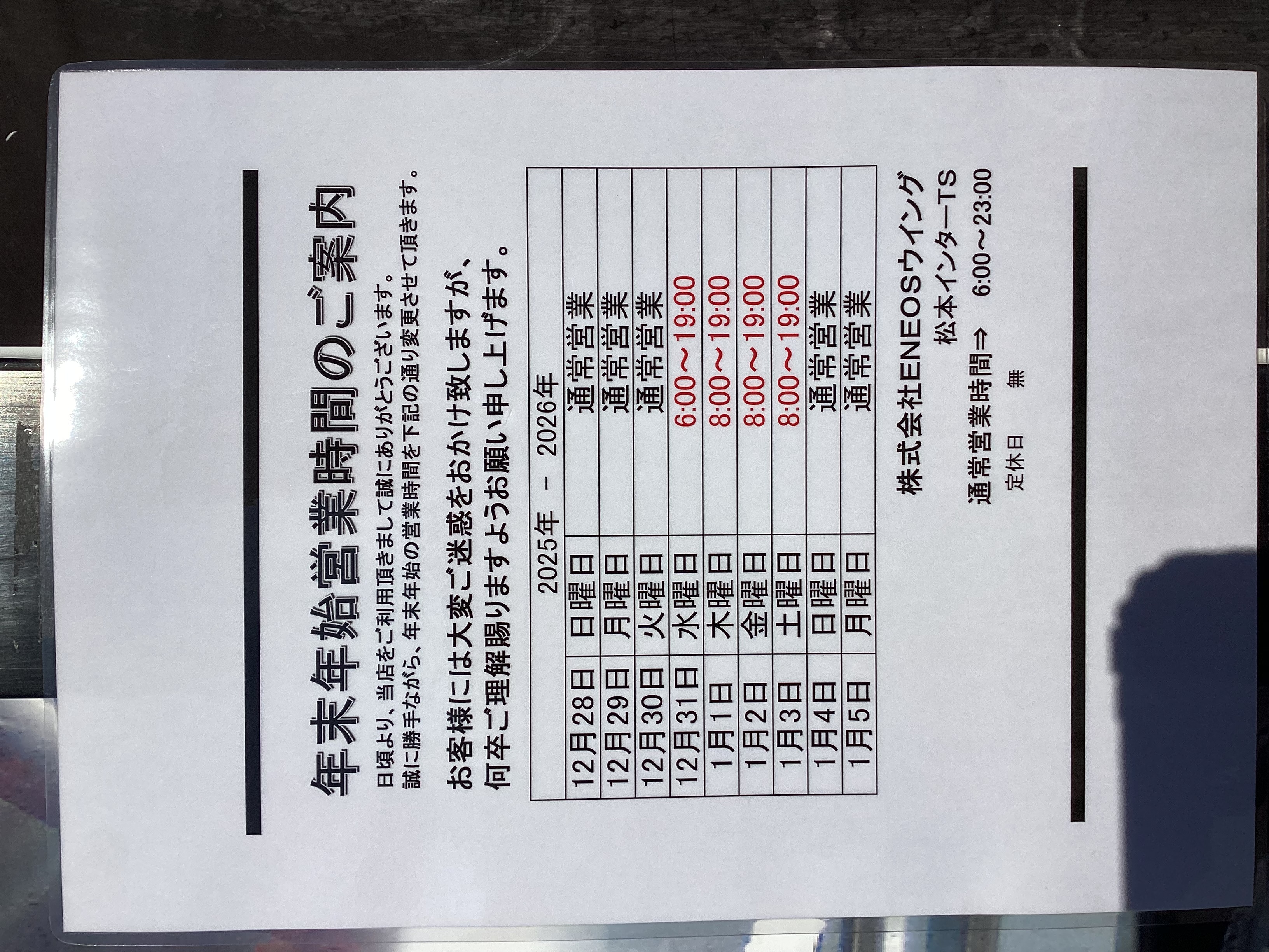 こんにちは!松本インターTSです😊✨年末年始は恒例の大掃除をスタッフみんなで頑張りました🚗💨冬の晴れた寒い日、ピカピカにするために普段手が届かないところまでしっかりお掃除!「断捨離」と「模様替え」も同時に進めて、不要なものを整理して気分もスッキリ。お客様が気持ちよくご利用いただけるよう、待合室やトイレも丁寧に磨きました。お店全体が明るくなり、なんだか新しい一年のスタートにぴったりな雰囲気です♪最近は私自身も家で断捨離をしていたので、お店でも同じようにスッキリ感を味わえて最高な気分です。やっぱり整理整頓って大事ですね!さて、冬は路面凍結や雪道が多い季節。車の調子が気になる方も多いと思います。松本インターTSでは給油だけでなく、洗車や車検など愛車ケアのサービスもご用意しています。特にこの季節はタイヤの空気圧チェックやワイパーゴムの状態確認、オイル・ウォッシャー液の補充など定期点検がおすすめです。タイヤの減り具合も安全運転には欠かせませんので、ぜひお気軽にご相談ください。そして今ならエネオスアプリのお得なキャンペーンも実施中!アプリを使うと給油や洗車がもっと便利になってポイントも貯まりますよ。この機会にぜひダウンロードしてみてくださいね。毎日寒い日が続きますが、お出かけ前にはガソリンスタンドで愛車チェックをして、安全・快適なドライブを楽しみましょう!皆さまのお越しを松本インターTSでお待ちしています😊