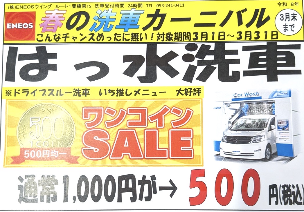 皆さまへ先行して発表します!2026年3月1日〜31日までずーっと1番人気あるドライブスルー洗車のはっ水洗車が通常1,000円が…期間中500円でご利用できます!・屋根付き拭きあげ場完備!・拭きあげ専用タオル完備!・コイン掃除機5分100円!たくさんのご利用お待ちしております!