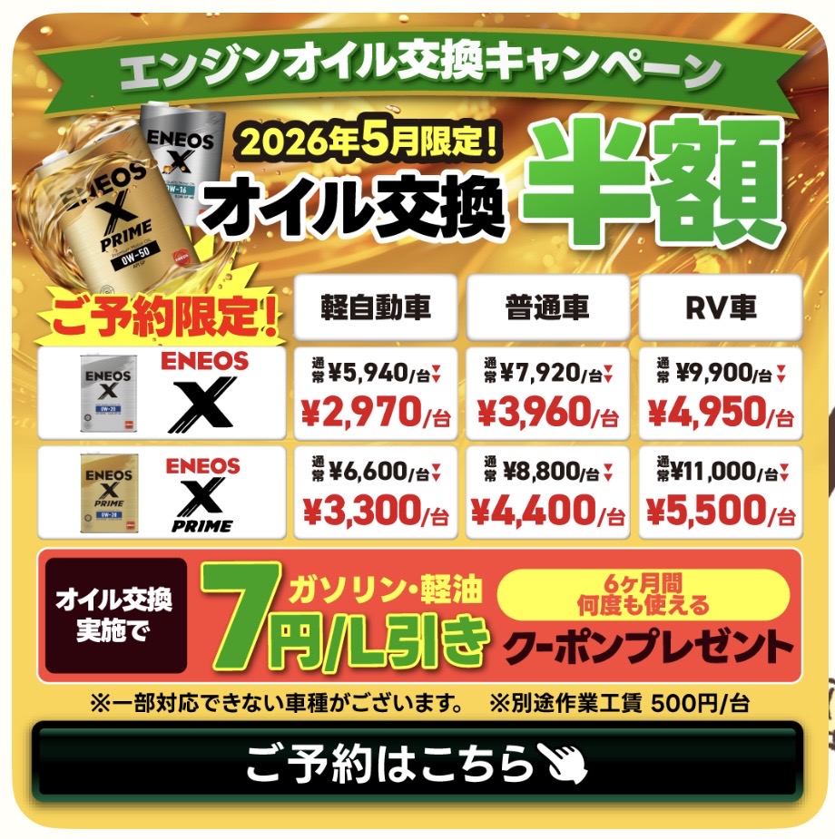 皆様お待ちかねのオイル半額キャンペーンのご案内です˚✧₊⁎❝᷀ົཽ≀ˍ̮ ❝᷀ົཽ⁎⁺˳✧༚x・xpシリーズが半額に!!!しかも、なんと!!!事前予約で洗車機がどのコースも一回無料!!!お車の定期的なメンテナンスにはオイル交換が必須です!!!ぜひこの機会にご利用ください☺︎