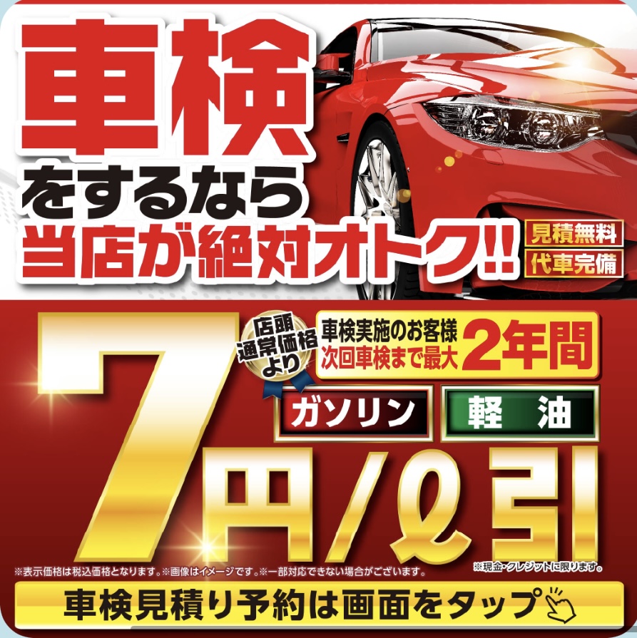 当店で車検を実施させていただいたお客様には1年間ガソリン7円引きクーポンプレゼント🎁さらに、車検実施から6ヶ月後にお客様のお車を無料で点検させていただきます!車検実施後のアフターフォローもお任せください˚✧₊⁎❝᷀ົཽ≀ˍ̮ ❝᷀ົཽ⁎⁺˳✧༚車検のお見積もりは無料でさせていただいておりますのでお気軽にお問合せください!