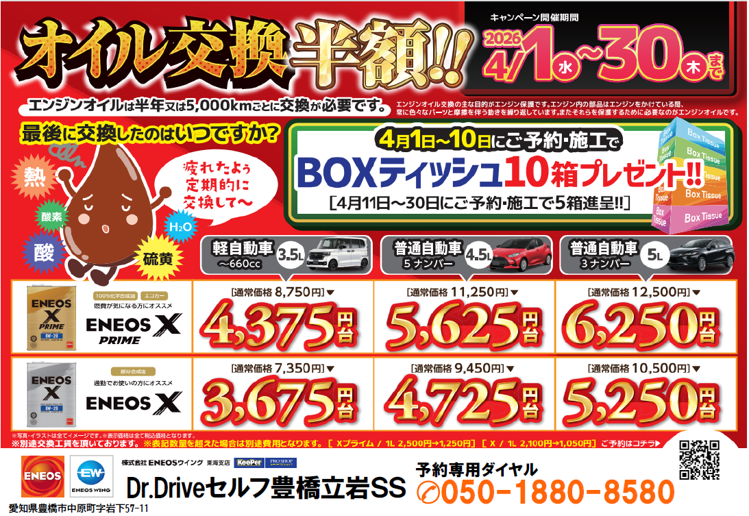 エンジンオイルは半年または5,000kmごとの交換が目安です。最後に交換したのは、いつですか?只今、オイル交換が《半額》になるお得なキャンペーンを実施中!🎁 さらに嬉しい特典!4月1日~10日にご予約・施工の方にはBOXティッシュ10箱プレゼント!※4月11日~30日にご予約・施工の方は5箱プレゼント!🔧 対象オイル・価格(一例)ENEOS X PRIMEENEOS X軽自動車・普通車(3.5L/4.5L/5L)まで対応※車種・使用量により価格が異なります🗓 キャンペーン期間2026年4月1日(水)~4月30日(木)📞 ご予約・お問い合わせコチラ👇セルフ豊橋立岩SS予約専用ダイヤル:050-1880-8580Web専用HP:Dr.Driveセルフ豊橋立岩SSのWEB予約 | 車のメンテナンス・車検ならENEOSウイングオイル交換をご検討中の方は、このお得な機会をぜひご利用ください!