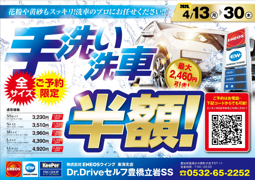 🚗✨【期間限定キャンペーン】✨🚗花粉や黄砂で汚れた愛車をスッキリ!手洗い洗車 半額!!🗓 2025年4月13日(月)〜4月30日(木)⏰ 完全ご予約制・全サイズ対象💰 最大2,460円引き!プロの手洗い洗車でピカピカに仕上げます✨☎ご予約はコチラ👇0532-65ー2252📲Web予約はコチラ👇Dr.Driveセルフ豊橋立岩SSのWEB予約 | 車のメンテナンス・車検ならENEOSウイング⚠️ 予約枠に限りがありますので、お早めに!