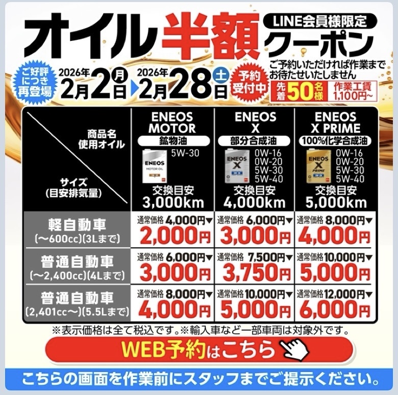 こんにちは!関西支店4エリア「第2神明明石西インターチェンジTS」の小川です😊✨今日はオイル交換と車検の事前見積もり作業を行いました!2月はオイル半額です!お車の安全を守るためには、オイル交換や車検はとても大切な作業です。普段から「丁寧な作業」を心がけているので、お客様のお車も安心してお預けいただけます🚗オイル交換はエンジンの調子を保つために欠かせません。古くなったオイルはエンジンの負担になってしまうので、定期的な交換がおすすめです。また、車検の事前見積もりでは、お客様のご要望やお車の状態に合わせてしっかりチェックしています。ご不明な点があれば何でもご相談ください♪今日は2月とは思えないほど暖かい日でした、冬の時期は急な気温変化や路面状況にも注意が必要です。ワイパーやウォッシャー液の補充、タイヤの空気圧や減り具合などもこの機会に点検してみてはいかがでしょうか?安全運転のためにも、小さなことでもお気軽にスタッフまでお声がけください👍さらに今なら、「エネオスアプリ店頭初回登録」で燃料10円引きキャンペーンを実施中です!このチャンスをぜひご利用くださいね⛽️これから春先に向けて花粉や黄砂も増えてくる季節。お車のメンテナンスで快適なドライブを楽しんでいただけるよう、お手伝いします。ガソリンスタンドならではのサービスで皆さまのお越しをお待ちしています!また次回も店舗の日常やお得情報などをお届けしますので、お楽しみに!