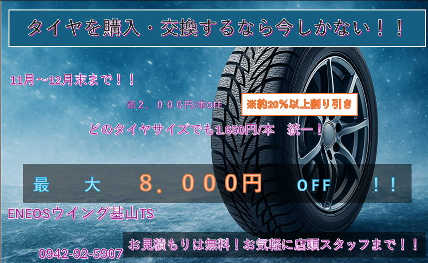 こんにちは、ENEOSウイング基山TSです!12月の末まで有効なタイヤ1本 2,000円引きキャンペーンを実施いたします。ノーマルタイヤ、スタッドレスタイヤを購入予定の方!今がチャンスですよ!!それに伴い、工賃も1,650円に統一させていただきます!(1本)詳しくは店頭スタッフまで!!!!!!!!!