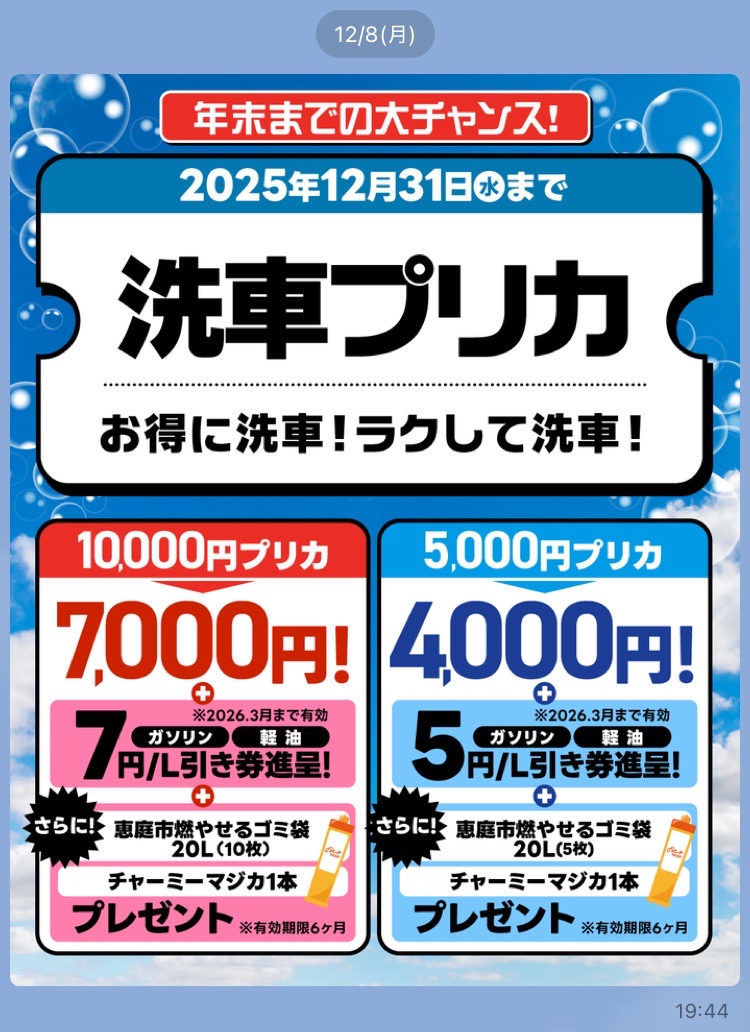 こんにちは!北海道支店2エリア、恵庭バイパスTSです🚗✨今日は2025年12月25日、クリスマスですが、当店は朝から洗車で大忙しでした!⛄️冬の北海道は道路に雪や融雪剤がまかれているので、車の下回りやボディがとても汚れやすい季節。お客様から「冬こそ洗車が大事だね!」という声をたくさんいただきました。洗車サービスでは、ボディだけでなくタイヤ周りや窓ガラスまでしっかりとキレイに仕上げて、お客様の愛車をピカピカにしています。寒い中、自分で洗うのは大変…そんな時こそ恵庭バイパスTSのガソリンスタンドにお任せください!また、今だけのキャンペーンとしてオイル交換が半額になっています!エンジンオイルは冬場になると特に劣化しやすくなるので、この機会にぜひご利用ください。オイルが古いままだとエンジンへの負担も増えてしまうので、定期的な交換がおすすめです。さらに、これからますます寒さが厳しくなる季節。ワイパーゴムやウォッシャー液の点検、タイヤの空気圧チェックもお忘れなく!凍結した道路ではタイヤの減り具合も安全運転に直結しますので、ご来店時にはスタッフが無料で点検いたします。最近は雪の日も多くなってきました。寒さでバッテリーが弱りやすい時期でもあるので、不安な方はお気軽にご相談くださいね😊今日もたくさんのお客様とお話できて、とても充実した一日でした!これからも安心・快適なカーライフをサポートできるよう頑張ります。皆さまのご来店を心よりお待ちしております!