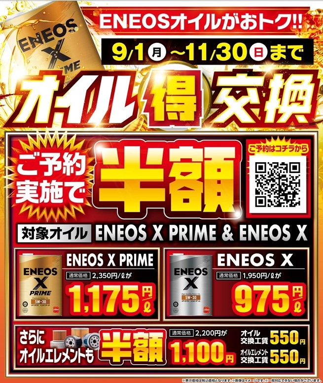 ただいま、11月30日までの期間限定でエンジンオイル&エレメント交換が半額‼️汚れたオイルは燃費の悪化やエンジントラブルの原因にも…😥快適&安心なドライブのために、定期交換がおすすめです🛠️🕘【受付時間】9時〜20時📞【予約優先】でスムーズにご案内します♪この機会にぜひ、愛車のメンテナンスを🌿