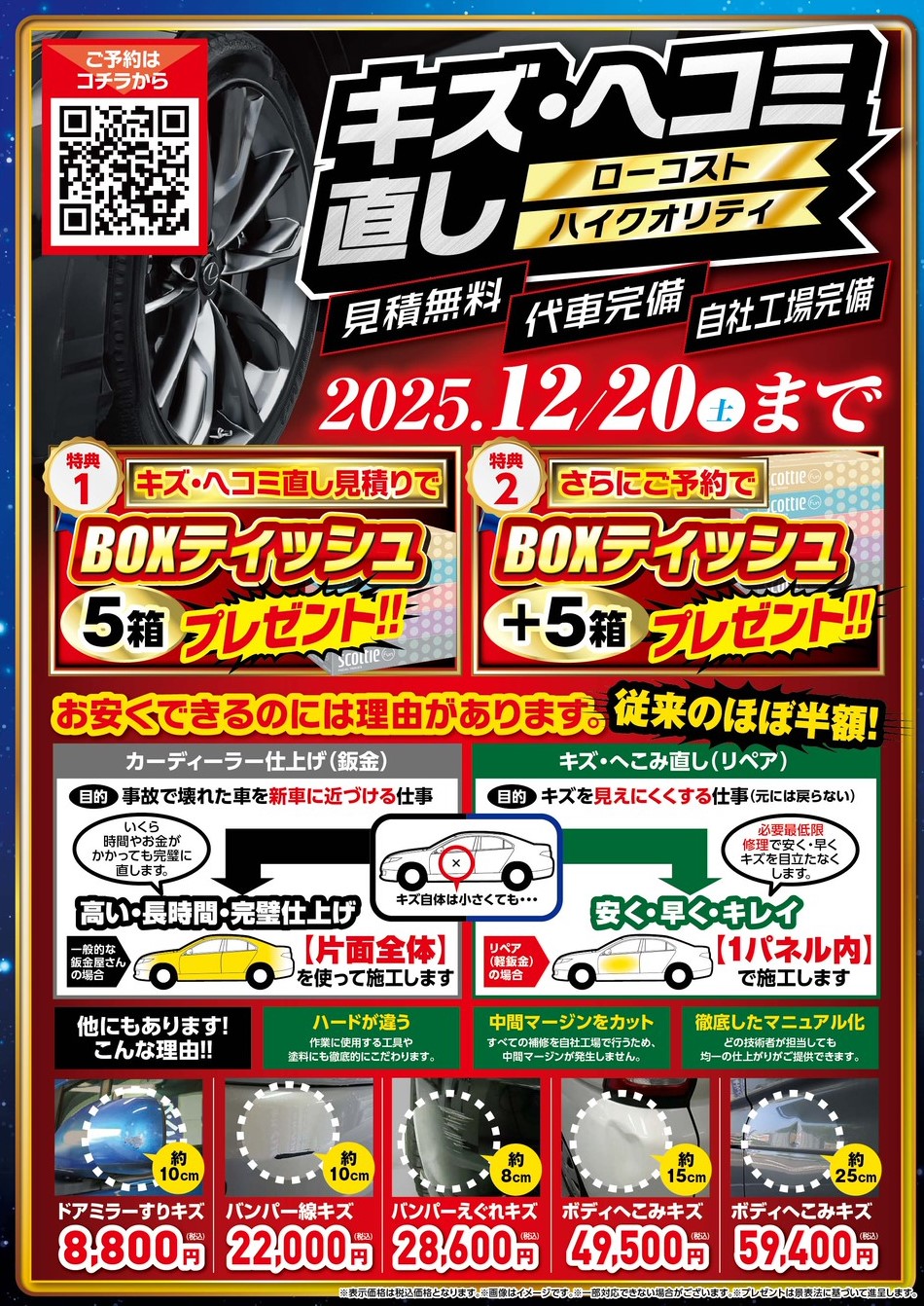 愛車のちょっとしたキズやへこみ、気になっているけど修理は高そう…とあきらめていませんか? そんな方に朗報です📣12月20日までの期間限定! キズ・へこみ直しキャンペーン開催中🎉 バンパーやドアなどの軽度な外装キズを、高品質&スピーディー&低価格で修復いたします!🔧通常の板金修理(ディーラー仕上げ)に比べて、費用はほぼ半額‼️ しかも必要な箇所だけを丁寧に直すから、仕上がりも◎🎁【特典①】 見積もりだけでもOK!ご来店でBOXティッシュ5箱プレゼント!🎁【特典②】 事前予約の上で見積もりいただくと、さらに**+5箱進呈✨**🧾 見積もり無料 🚗 代車も完備 🏭 自社工場だから安心&スムーズ✅【予約優先】で待ち時間も最小限 🕘【受付時間】9時〜20時年末に向けて愛車をキレイに整えるチャンスです! まずはお気軽にご相談・ご予約ください😊