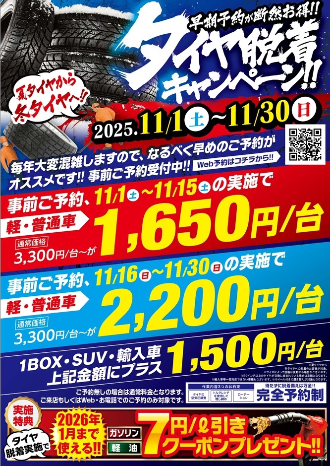 11月30日までの期間限定キャンペーン開催中! 【ホイール付きタイヤ】なら 11/1〜15の交換で1,650円/台**、11/16〜30は2,200円/台(※軽・普通車)✨ さらに、持ち込みタイヤの交換も大歓迎! こちらは6,600円〜対応しております🔧 1BOX・SUV・輸入車は+1,500円🚗 交換実施でガソリン7円/L引きクーポン🎁もプレゼント! ✅【予約優先】でスムーズにご案内 🕘【受付時間】9時〜20時 混み合う前のご予約がおすすめです!