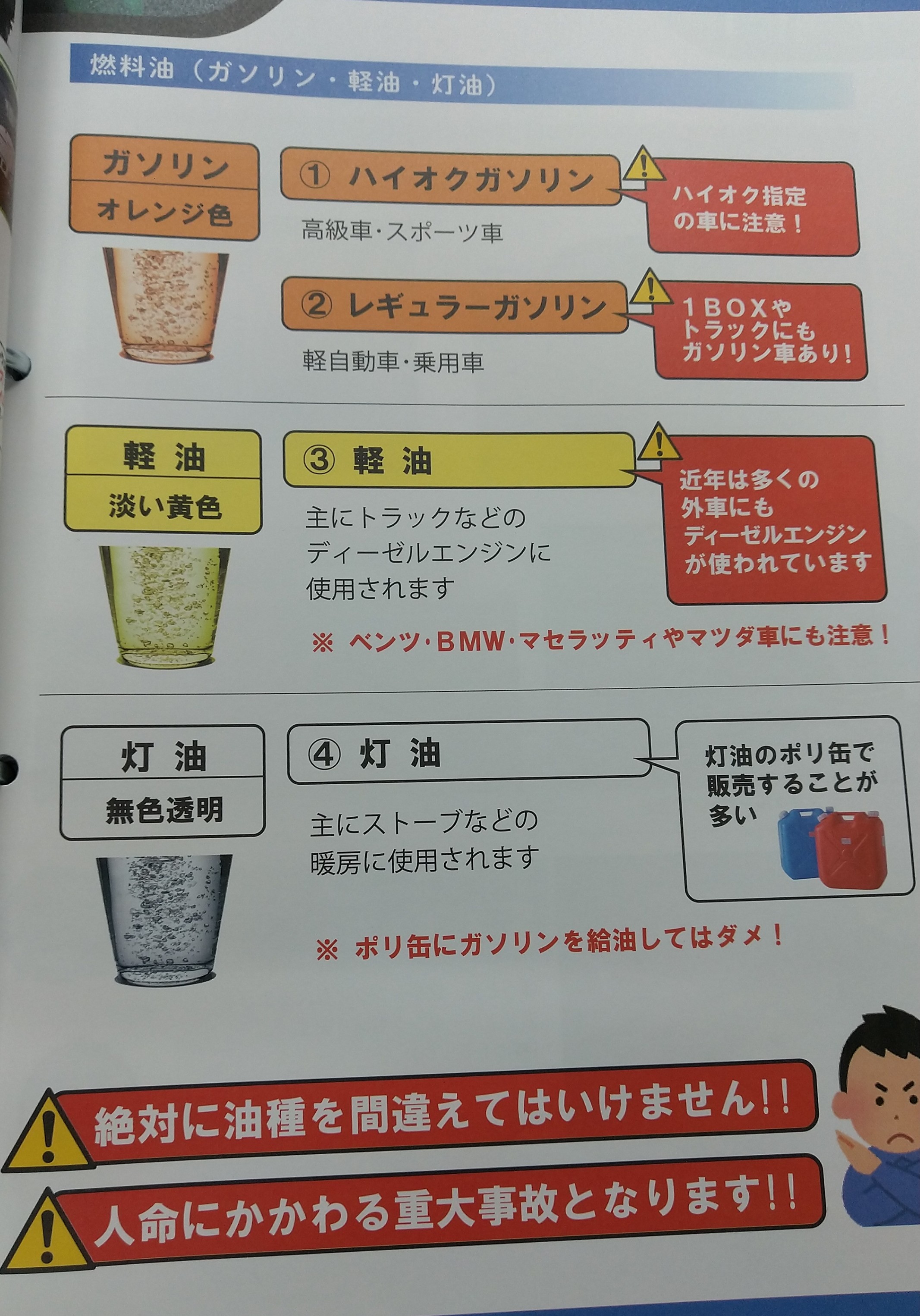 こんにちは!東京支店1エリアの「湾岸浦安フリートTS」です😊✨今日は私がガソリンスタンドで働き始めてから驚いたこと「ガソリンと軽油の色の違い」について、ちょっとした豆知識をお届けします🚗普段、何気なく使用しているガソリンや軽油が着色されていることはご存じですか❓ガソリンは精製された時は無色透明で軽油は無色透明から淡い黄色なんですが、間違って取り扱わないように着色しているんです😮実際に色の違いを確認する機会はほとんどないと思いますが、上記の写真のようにちゃんと色分けされてるんですよ✨勝手に無色透明だと思い込んでいたので、これを知ったときは目からウロコでした😊また、これから活躍する暖房器具の石油ストーブの燃料は灯油ですが、灯油の取り扱いにも目からウロコが・・・灯油は消防法で【危険物】に分類されるため、さまざまな規制があるんです😱例えば、ご自宅などで灯油を保管する際は、消防法で認められた容器(例えば赤色の灯油用ポリ容器)を使用する必要があります。また、石油ストーブの給油タンクに直接給油することも禁止されています。灯油を取り扱う際に思い出していただければ嬉しいです🤗最近はますます寒くなりましたね🍂この季節は朝晩の寒暖差が大きくなるので、車のメンテナンスも大切です!特にワイパーやオイル、ウォッシャー液、タイヤの空気圧や減り具合など、定期点検がおすすめです。突然の雨にも備えてワイパーの拭き取り具合もチェックすると安心ですよ☔早め早めの点検で安心カーライフを送りましょう!何か気になることがあればお気軽にご相談ください😊皆さまのお越しを心よりお待ちしています!最後までご覧いただきありがとうございました✨