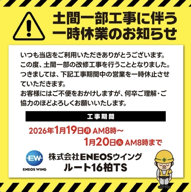こんにちは!東京支店2エリア「ルート16柏TS」のライフランナー向井です😊 今日は、みなさんに大事なお知らせと、これからの冬に向けた車のケアについてシェアしたいと思います!まずは重要なお知らせから。来月の1月19日AM8:00~1月20日AM8:00まで、店舗の工事のため「ルート16柏TS」は一時休業となります。この期間はガソリンスタンドをご利用いただけませんので、ご不便をおかけしますがご理解とご協力をお願いします🙇♂️ いつもご利用いただいている皆さまにはご迷惑をおかけしますが、安全で快適な店舗環境を整えるための工事ですので、何卒よろしくお願いいたします。さて、冬本番が近づいてきて寒さも増してきましたね!この季節は、車にとっても厳しい時期。特にタイヤの空気圧やワイパーの劣化、オイルやウォッシャー液の不足など、ちょっとしたことでトラブルにつながることがあります。出先で困らないように、定期点検をおすすめしています🚗「ルート16柏TS」ではガソリンスタンドとして給油だけでなく、洗車や車検など幅広いサービスをご用意しています。冬道は融雪剤や泥汚れが付きやすいので、こまめな洗車で愛車をキレイに保つと同時にサビ対策にもなりますよ。また、車検や点検ではプロがしっかりチェックするので安心です。最近は日中でも冷え込む日が多くなってきているので、「エンジンオイルは大丈夫かな?」「タイヤの溝は十分かな?」といったちょっとした不安もぜひスタッフにご相談ください。家族とのお出かけ前にも、お気軽に立ち寄って点検してみてくださいね👍今後も皆さんのカーライフをサポートできるよう、スタッフ一同元気いっぱいでお待ちしています!冬のお出かけ前にはぜひ「ルート16柏TS」にお立ち寄りください。そして、一時休業期間にはご注意いただきつつ、その前後でしっかりメンテナンスしておきましょう!また何かあれば気軽にコメントしてください。それでは今日も安全運転で素敵な一日をお過ごしください⛄