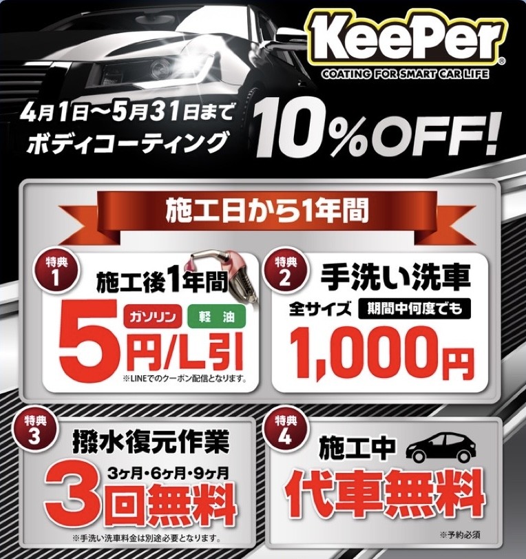 4月~5月中にボディコーティングを施工いただくと、施工費用10%OFFに加え、その後のカーライフをサポートする特典が多数付帯します。【施工者限定の4大メリット】給油がお得:ガソリン・軽油が 5円/L引き!※LINEにて配信いたします。洗車がお得:プロの手洗い洗車がいつでも 1,000円!撥水が続く:定期的な撥水復元作業(3回分)が 無料!※別途手洗い洗車料金1,000円掛かります。利便性:施工中の 代車無料!※要予約キーパーHPはこちら♪ネットで予約するならこちら♪