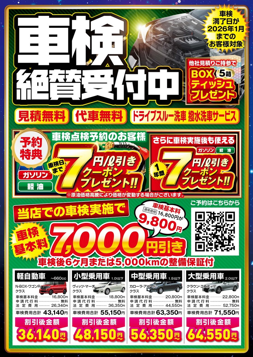\車検満了が2026年1月までの方へお知らせです!/当店では現在、期間限定の車検キャンペーンを実施中✨🔧今なら車検基本料が7,000円引き‼️例)軽自動車の場合、通常43,140円 → **36,140円(税込)**に❗🛠️【車検後6ヶ月 or 5,000kmの整備保証付き】安心のアフターサポートで、もしものトラブルにも対応できます💡📋【見積もり無料】【代車無料】さらに、**手洗い洗車&車内清掃付き🚿✨**で車内もピカピカに!🎁【予約特典】車検をご予約いただいた方に、ガソリン・軽油に使える7円/L引きクーポンをプレゼント⛽🎁【実施特典】車検完了後にも、同じく7円/L引きクーポンを進呈!なんと合計2回分もらえるチャンスです🙌📦【他社見積りをお持ちの方にも!】BOXティッシュ5箱をプレゼント🎁(※持参時に限ります)🚙対象車種も幅広く対応!・軽自動車・小型〜大型乗用車※輸入車や特殊車両もお気軽にご相談ください📞【予約優先】でスムーズなご案内が可能です🕘【受付時間】9時〜20時年内の車検をお考えの方は、ぜひこのおトクなタイミングをお見逃しなく!まずはお気軽にお問い合わせ・ご予約ください😊