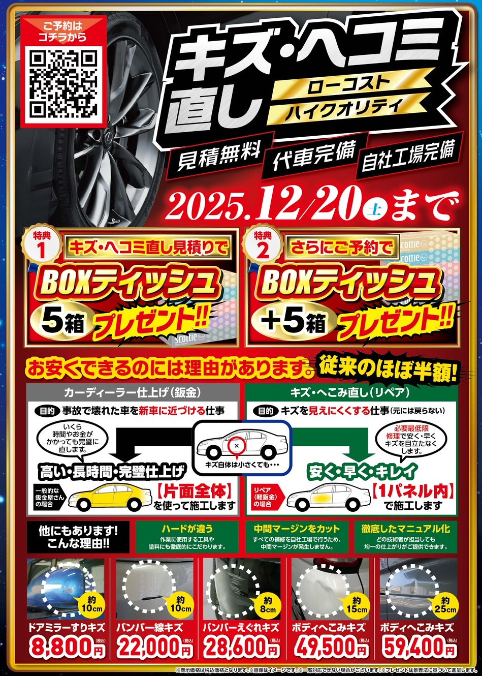 愛車のちょっとしたキズやへこみ、気になっているけど修理は高そう…とあきらめていませんか?そんな方に朗報です📣12月20日までの期間限定!キズ・へこみ直しキャンペーン開催中🎉バンパーやドアなどの軽度な外装キズを、高品質&スピーディー&低価格で修復いたします!🔧通常の板金修理(ディーラー仕上げ)に比べて、費用はほぼ半額‼️しかも必要な箇所だけを丁寧に直すから、仕上がりも◎🎁【特典①】見積もりだけでもOK!ご来店でBOXティッシュ5箱プレゼント!🎁【特典②】事前予約の上で見積もりいただくと、さらに**+5箱進呈✨**🧾 見積もり無料🚗 代車も完備🏭 自社工場だから安心&スムーズ✅【予約優先】で待ち時間も最小限🕘【受付時間】9時〜20時年末に向けて愛車をキレイに整えるチャンスです!まずはお気軽にご相談・ご予約ください😊