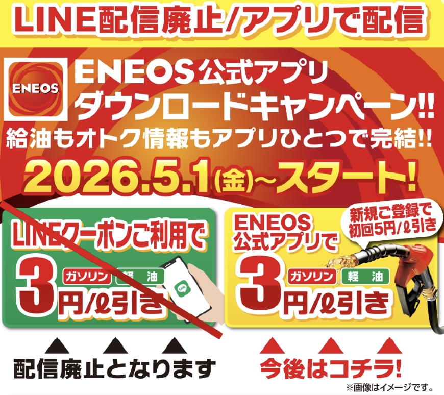 いつもお世話になっております。株式会社ENEOSウイングセルフ梅が岡SSです。この度、2026年4月末をもってLINEによる燃料割引クーポン配信を終了することとなりました。5月1日より、燃料割引クーポンの配信はENEOSアプリからのみとなります。お客様にはご迷惑をおかけいたしますが何卒ご了承いただきますようお願い申し上げます。ENEOSアプリをまだご利用になっていないお客様につきましては、この機会にぜひENEOSアプリの利用をご検討いただきますようお願いいたします。ENEOSアプリダウンロードは 👉 こちら‼️ご不明な点がございましたら店頭スタッフまでお気軽にお尋ねください。
