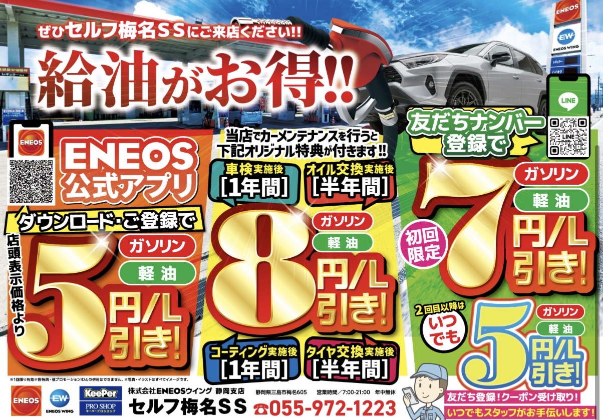 三島市にあるセルフ梅名SSは、国道136号線沿い、八反畑交差点からすぐの場所に位置します。 年中無休で給油可能となっておりますので、年末年始な土も安心してご利用いただけます。 給油のほか、コーティング、車検、板金、カーリースなどのメニューも取り扱っております。 また、災害時の給油対応も可能です。 お支払いは、現金をはじめ各種カードもご利用いただけます。 スタッフ一同心よりお待ちしております。