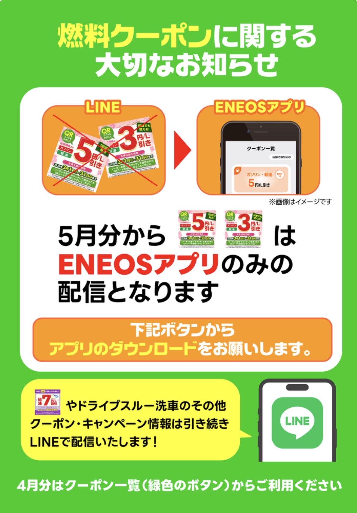 このたび、2026年4月末を持ってすることとなりました。5月分より燃料割引配信はENEOSアプリのみとなります。お客様にはご迷惑ををおかけしますが何卒ご了承いただきますようお願い申し上げます🙇ENEOSアプリをまだご利用になっていないお客様につきましては、この機会にぜひENEOSアプリの利用をご検討いただきますようお願いいたします。カーメンテナンスご利用のお客様への燃料割引クーポンは引き続きLINEにて配信いたしますのでよろしくお願いいたします。ENEOSアプリのダウンロードはこちらから👇⭐️ENEOSアプリ⭐️