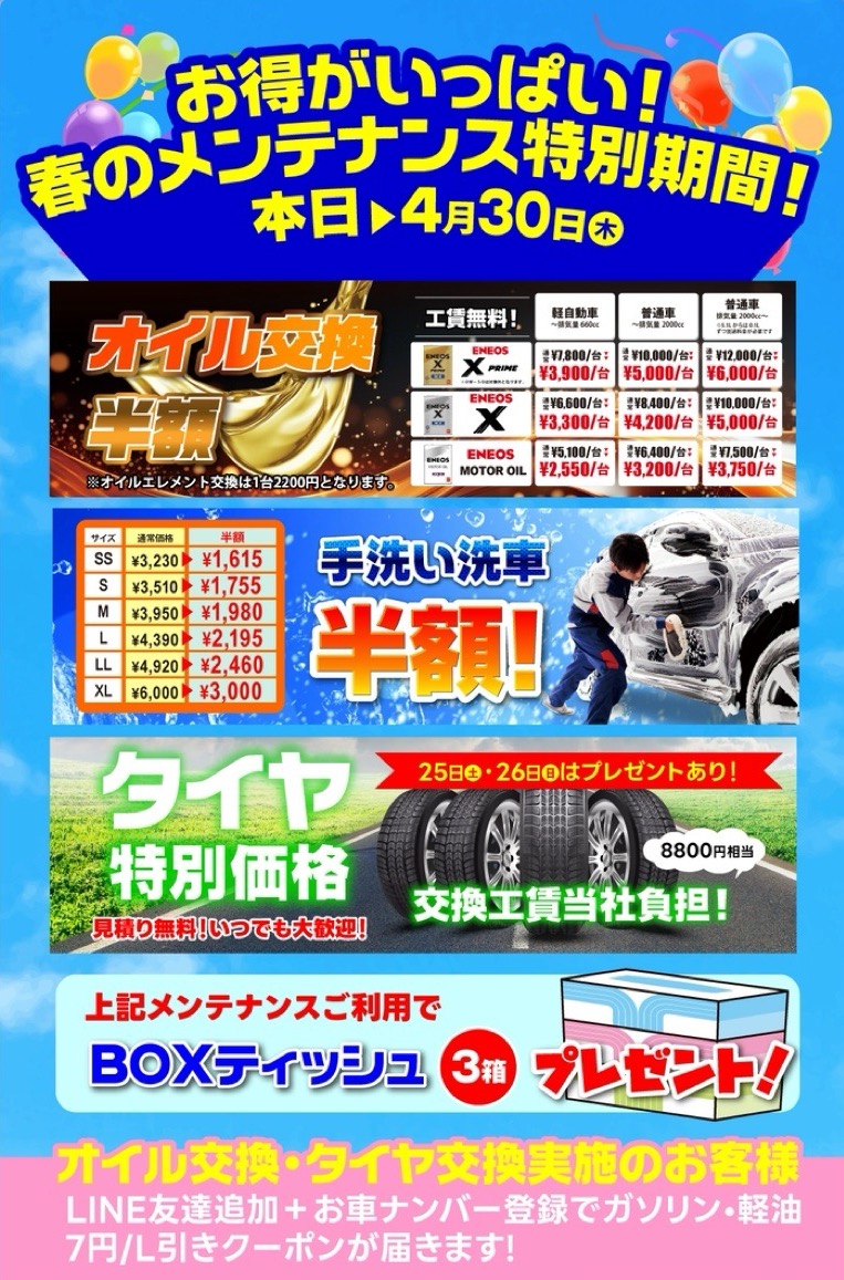 セルフ村松SSです😄現在当店では🚗エンジンオイル交換✨半額✨🫧手洗い洗車✨半額✨のキャンペーンを行っております🙌さらにタイヤも特別価格🛞25日(土)・26日(日)にタイヤ交換を実施のお客様には食品が当たるくじ引きもプレゼント🎁ゴールデンウィークのお出掛け前にぜひご利用ください🙆たくさんのお問合せお待ちしております☺️ご予約はこちらをタップ👇⭐️セルフ村松SSで予約する⭐️