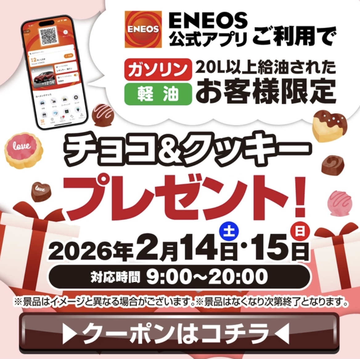 こんにちは!セルフ有玉SSの横沼です😊今日はとっても暖かくて、冬なのに春が近づいてきたような気持ちの良い一日でした🌸さて、今回は当店で開催のバレンタインイベントについてご紹介します!2月14日(土)と15日(日)の2日間限定で、ENEOSアプリを使って20L以上給油していただいた方には、お菓子のプレゼントをご用意しています🍫❤️🩹さらに、アプリ内でマイカー登録をしていただくと、その場でくじ引きにもチャレンジできますよ🎁この機会にぜひご家族やお友達と一緒にご来店ください。最近は花粉や黄砂も舞い始めて、車の汚れが気になる季節になってきましたね。そんな時期こそ、ドライブスルー洗車がおすすめです🚗今ならENEOSアプリを新規ダウンロードしていただくと、ドライブスルー洗車半額券をプレゼントしています!また、冬から春への季節の変わり目は、車の点検も大切なタイミングです。ワイパーやオイル、ウォッシャー液の補充、タイヤの空気圧や減り具合など、定期的にチェックすることで安全運転につながります。セルフ有玉SSでは、お客様の安心・快適なカーライフをサポートするためにスタッフが丁寧にご案内していますので、お気軽にお声がけください!イベントやキャンペーン情報は随時発信していますので、「セルフ有玉SS」のブログ、ラインもぜひチェックしてください。またのお越しを心よりお待ちしております‼️