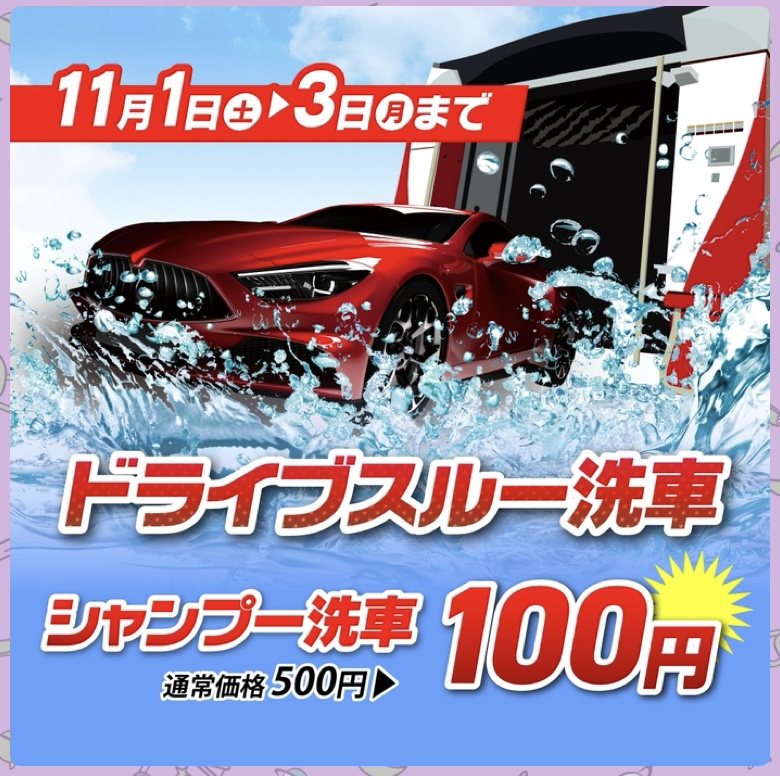 こんにちは🌞エネオスウイングセルフ高橋小林です。来月11/1〜11/3の3日間シャンプー洗車通常500円のところ100円でできちゃいます☺️この機会に是非ご利用くださいませ♪