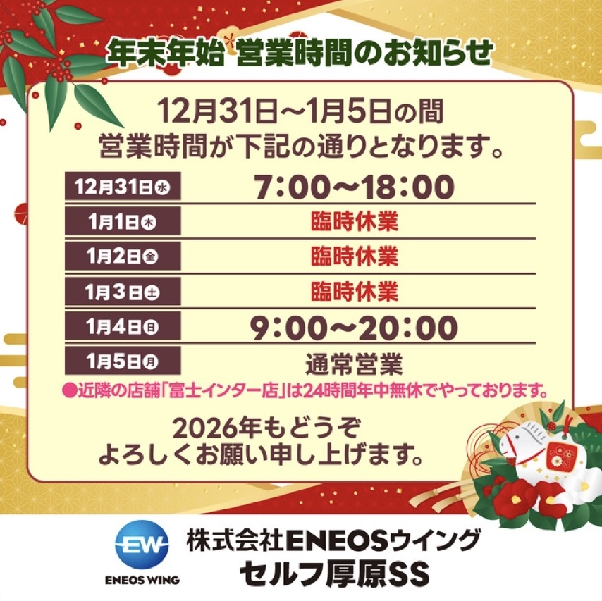 セルフ厚原SS年末年始営業案内。