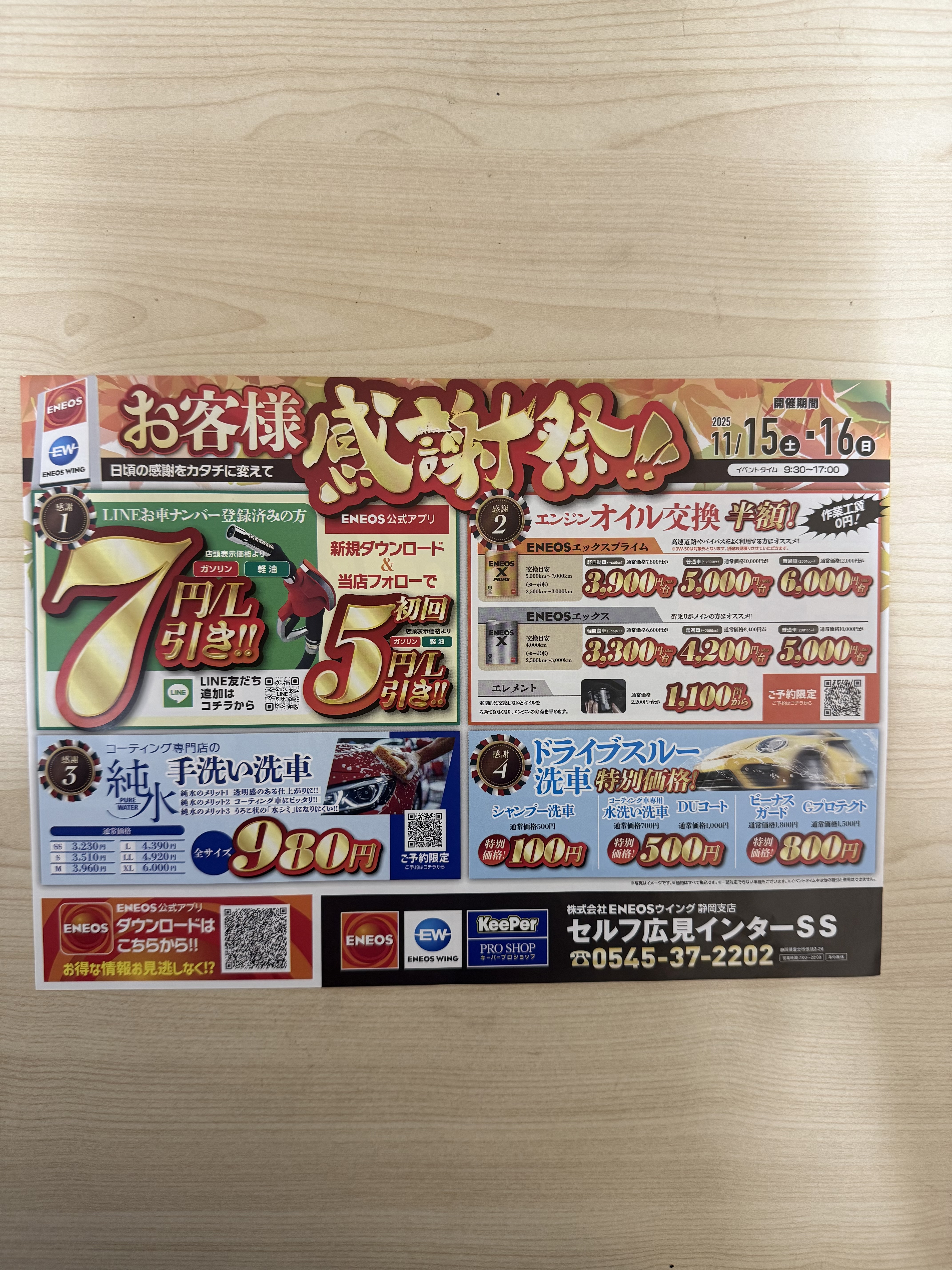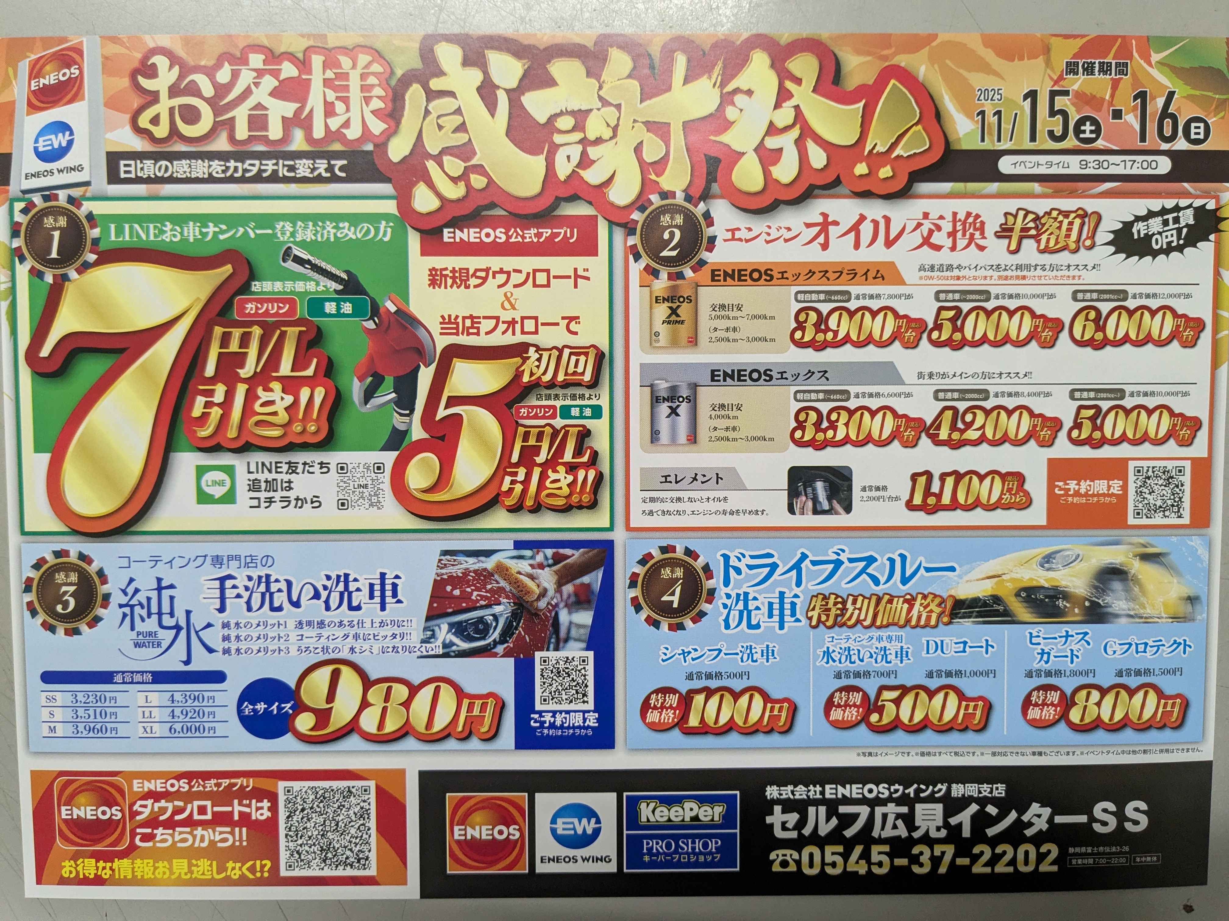 こんにちは!セルフ広見インターSSのです😊✨今週末15日・16日はお客様感謝祭を開催します!朝9:30〜夕方17:00まで、とってもお得なキャンペーンを実施中です🎉LINEお友達追加でガソリン・軽油がなんと7円引きになるほか、オイル交換&エレメント交換が半額&工賃サービスというスペシャル企画もご用意しています。 また、純粋手洗い洗車が全サイズ980円‼️(XLサイズは除きます)ドライブスルー洗車も特別価格なので、お急ぎの方にもぴったり!「コーティング」に興味がある方には、まずは手洗い洗車から体験していただくのがおすすめです。早めのご予約で割引もご案内していますので、この機会にぜひご相談くださいね。ガソリンスタンドって給油だけ…と思われがちですが、セルフ広見インターSSでは洗車・点検・オイル交換など幅広くサポートしています🚙💡お気軽にお声かけください。