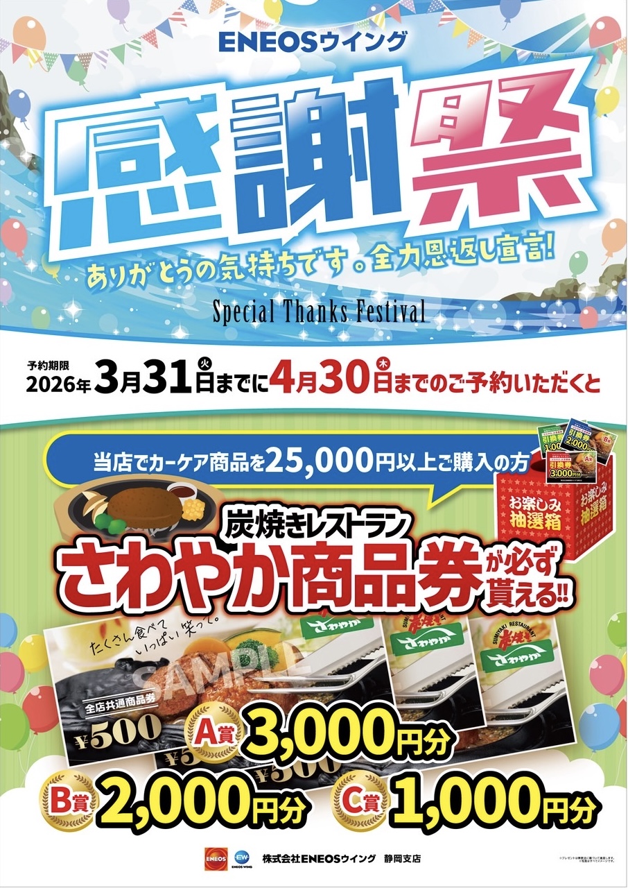 3月1日〜3月31日までに4月のご予約でさわやかの商品券が貰える‼︎カーケア商品25,000円以上の商品のご予約、4月にご購入の方20名様にプレゼント🎁