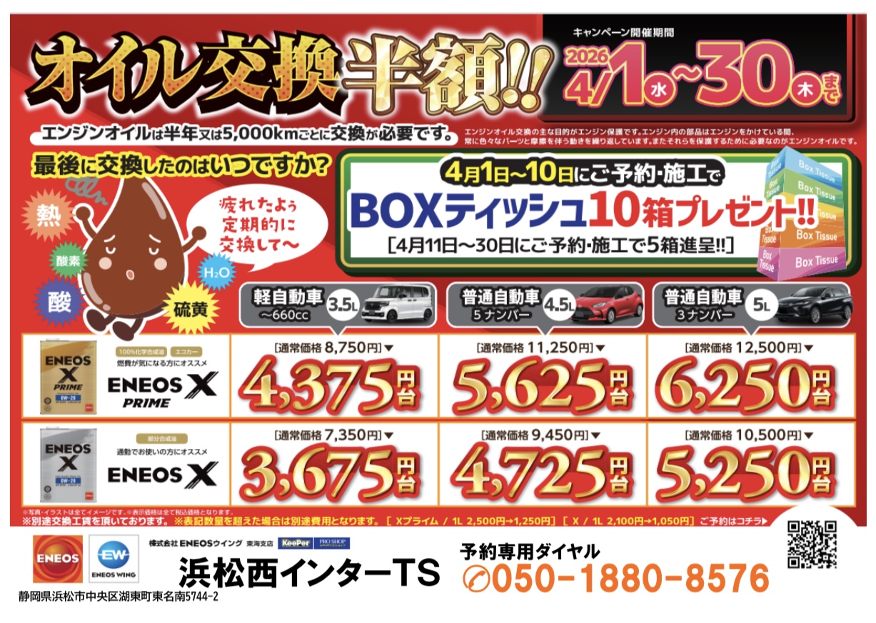 浜松西インターTSは、浜松西ICを降りてすぐの場所に位置します。 日常での給油はもちろん、高速ご利用前後に気軽にお立ち寄りいただけます。 給油は24時間、年中無休で、普通車、大型車のご利用が可能です。 給油サービスのほか、大型車専用洗車機設置、車検や板金、コーティング、カーリースなどのメニューも取り扱っております。 休憩スペースにはWi-Fiも設置しており、喫煙スペースもありますので、待ち時間なども快適にお過ごしいただけます。 お支払いは、現金、各種カードのご利用が可能です。 スタッフ一同心よりお待ちしておりますので、ぜひお近くにお越しの際は、お立ち寄りください!