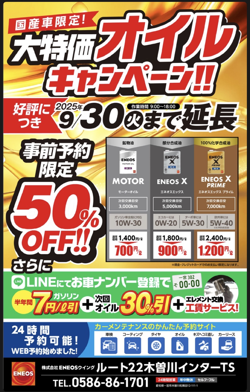 大好評につき9月末まで延長決定!事前予約限定オイル交換50%OFFキャンペーン開催※国産車に限ります。さらにLINEナンバー登録で半年間燃料7円/ℓ値引き+次回オイル30%OFF+エレメント交換工賃サービス是非この機会にオイル交換お任せください!
