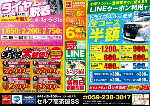 2026年4月1日~5月31日まで★タイヤ脱着(冬➡夏タイヤ)半額★軽自動車 :3,300円→1,650円普通車 :4,400円→2,200円1BOX・RV・輸入車 :5,500円→2,750円※完全予約制 要前日までのご予約当日予約・ご予約なしの場合は通常価格となります。※ホイール付きタイヤの履き替えが対象です。※一部対応できない車種もございます。★夏タイヤ4本セット 大特価★145/80R12 K370 30,800円→26,000円155/65R14 NEWNO 48,800円→29,800円 など※作業料・廃タイヤ処分・消費税を含んだコミコミ価格です。※その他のサイズも大特価でご用意しております。詳しくは店頭スタッフまでお気軽にお尋ねください。