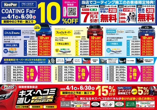 2026年4月1日~6月30日★キーパーコーティング★コーティング・アラカルト10%OFF※EXキーパーは5%OFF(新車登録より6か月までのお車は10%OFF)お得な当店限定オリジナル6点セットをご用意!!➊ホイールクリーニング ➋アンダーウォッシュ➌鉄粉除去(軽度) ➍超撥水ウィンドウコーティング(フロント)➎ピッチ除去 ➏運転・助手席の掃除機掛け★キズ・ヘコミ直し★期間中 最大15%OFFコーティングと同時施工でさらに5%OFF見積り無料・ご予約受付中!!