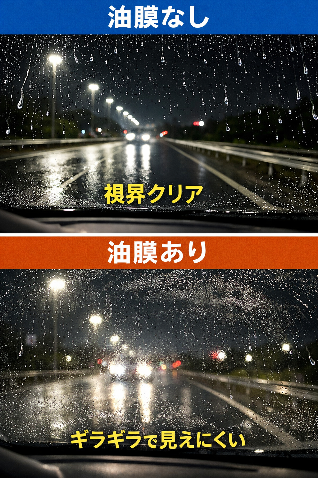 さて、今日は「油膜があると…」というお話です。フロントが見えづらい。実はこれ、油膜が原因のことが多いんです。油膜とは、車のガラスに付着した油分や汚れが薄い膜になってしまう状態のこと。雨の日や夜間、対向車のライトがギラギラしてとても見えにくくなってしまうので、安全運転の妨げにもなります🚗💦