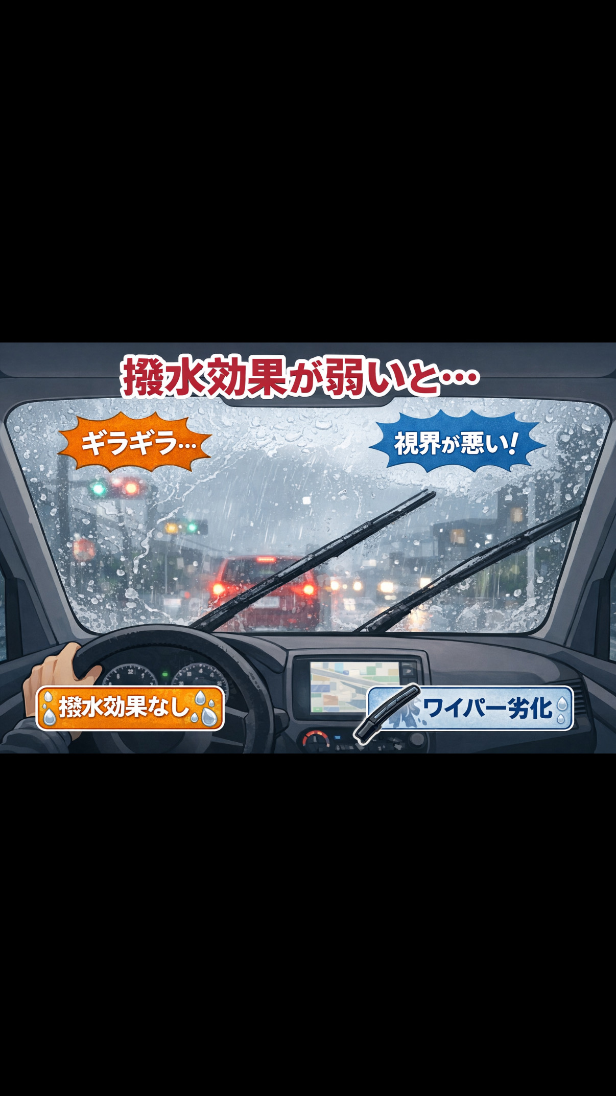 雨の日にフロントガラスの撥水が弱かったり、ワイパーが切れていると、運転中に視界がぼやけてしまい、とっても危険なんです💦特に夜間や対向車のライトが反射すると、さらに見えづらくなってしまうことも…。
