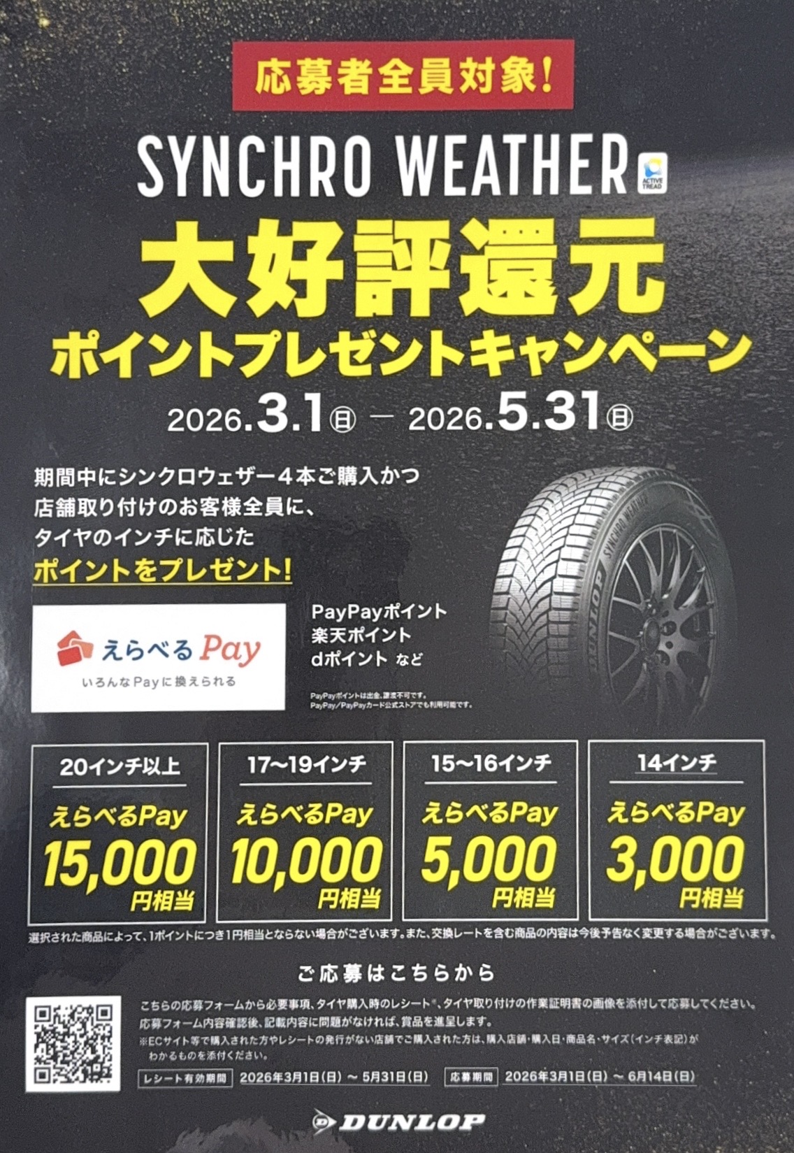 期間中にシンクロウェザー4本ご購入かつ店舗取り付けのお客様全員に、タイヤのインチに応じたポイントをプレゼント!🎁✨