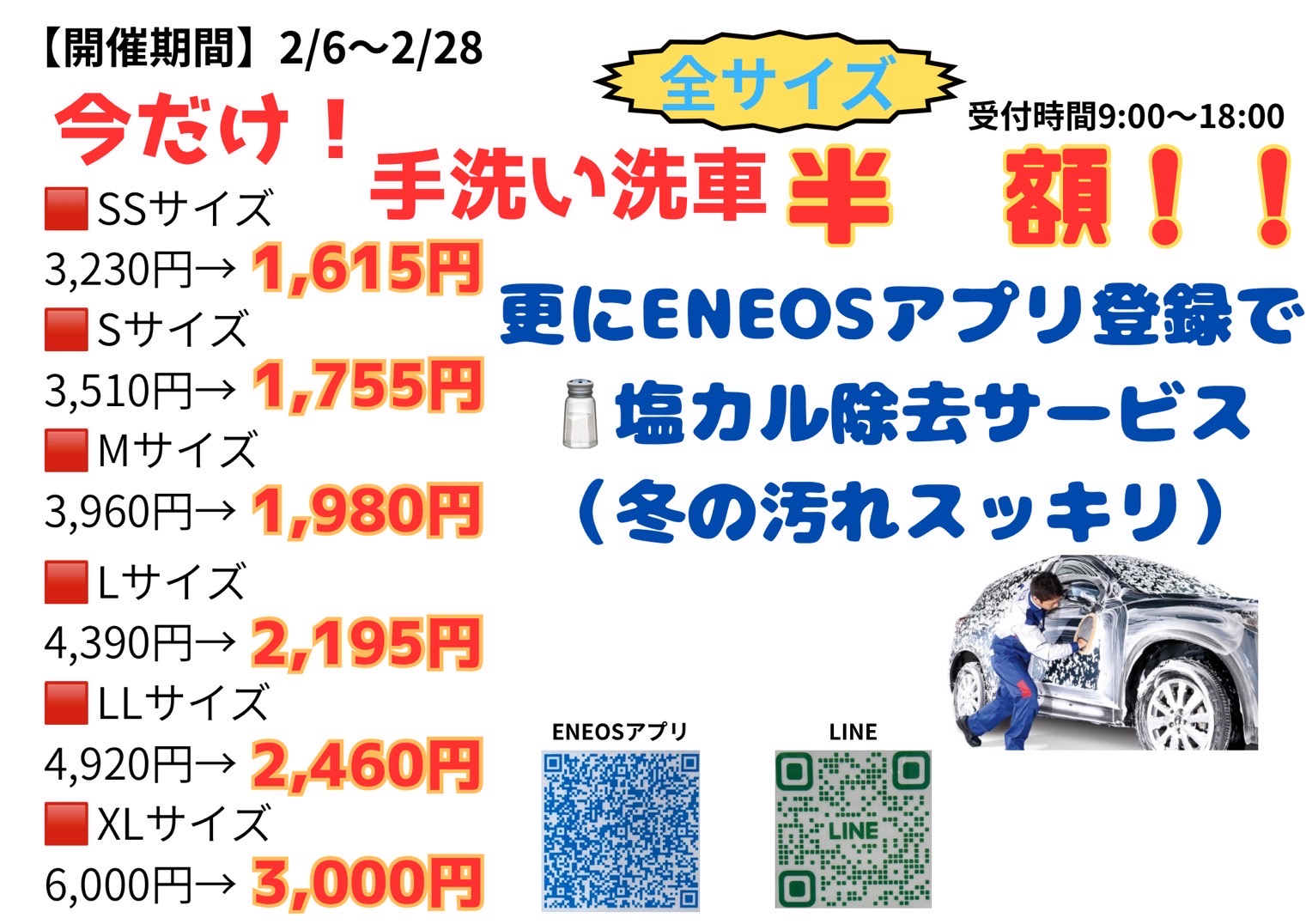 こんにちは!ルート8滑川インターTSのSSマネージャー篠原です。今日は、冬の寒さが続く中で「愛車のケア」にぴったりな2月限定の洗車キャンペーンについてご紹介します🚗✨今月は手洗い洗車がなんと全サイズ「半額」になっています!SSサイズなら1,615円、XLサイズでも3,000円と、とてもお得にプロの手洗いサービスを受けられます。さらに、ENEOSアプリに新規登録いただいた方には、冬道で気になる塩カル(道路にまかれる融雪剤)をしっかり落とす「塩カル除去サービス」を無料でご提供中🎁。この時期は塩カルによるサビが心配ですが、しっかりケアして大切な愛車を守りましょう。冬は雪や雨で汚れやすいだけでなく、気温差でワイパーやオイル、ウォッシャー液なども消耗しやすい季節です。タイヤの空気圧や減り具合もチェックしておくと安心ですよ。ルート8滑川インターTSでは洗車だけでなく、定期点検もお気軽にご相談いただけます。ちょっとした不安や疑問もスタッフまでお声掛けください😊僕自身も家族とドライブすることが多いので、「安全第一」と「快適さ」はいつも大事にしています。皆さんにも安心して冬道を走ってほしいと思いながら日々サービスしています!