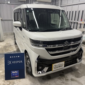 ホンダのエヌボックスに「EXキーパー」を施行しました!🚗✨ 当店「ルート1水口TS」にて、汚れが目立っていたボディを徹底的にケア。EXキーパーは、特に高い撥水性能と持続性が魅力で、洗車の手間もぐっと省けるんです👍。厚くしなやかなガラスの被膜が汚れを弾き、艶やかな輝きを長期間キープします。