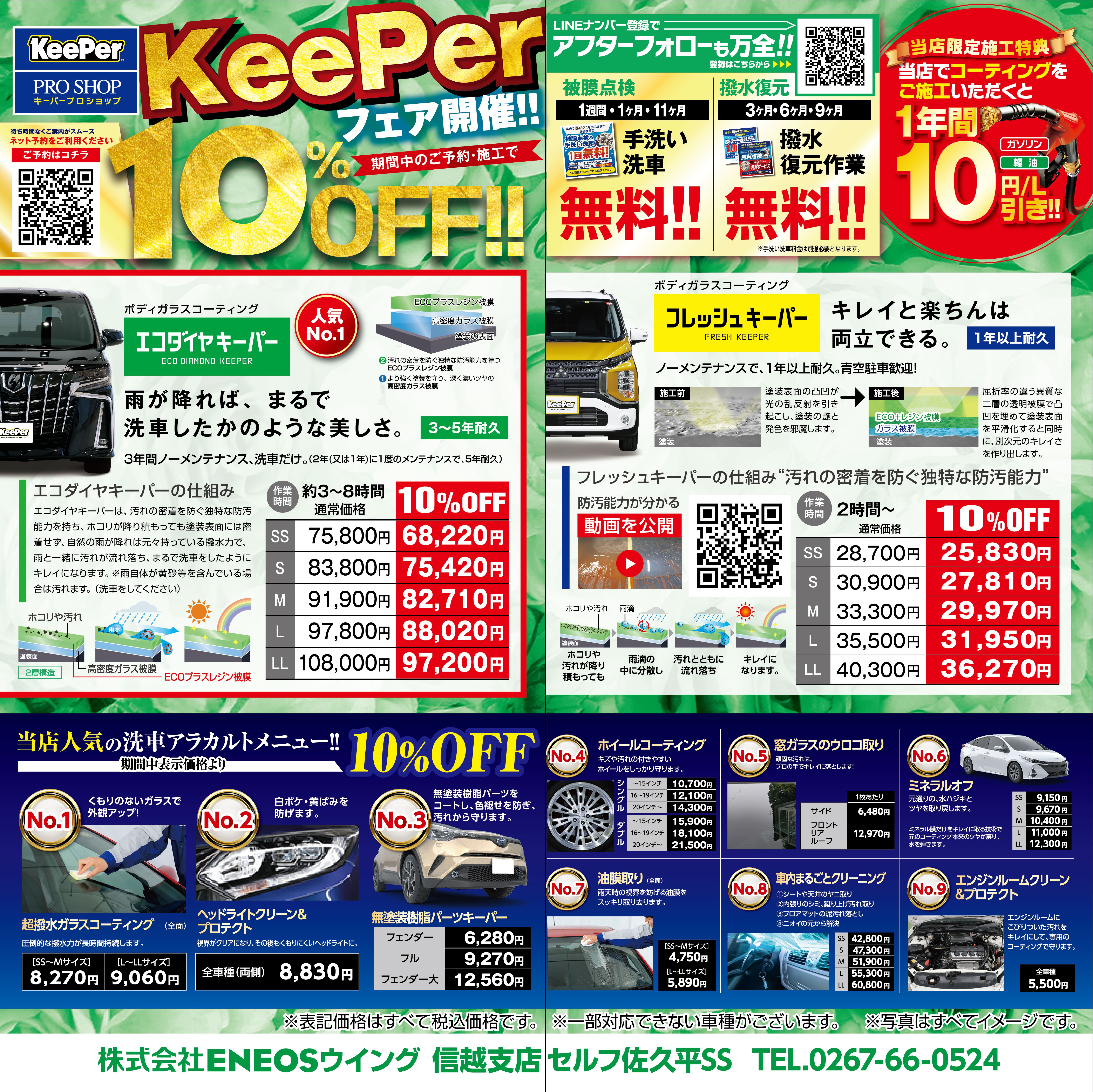セルフ佐久平SSは、「信州短大入口」交差点付近にあるENEOSマークが目印のガソリンスタンドです。 給油はもちろん、軽度のキズから大破した事故車両の修理、カーコーティング、車検整備など豊富なメニューで様々なご要望に対応しております。 ドライブスルー洗車機3台、高圧スプレー洗車機4台と充実した設備も人気です! お客様一人一人がご満足いただけるサービスとなるよう努めておりますので、お気軽にご来店ください!