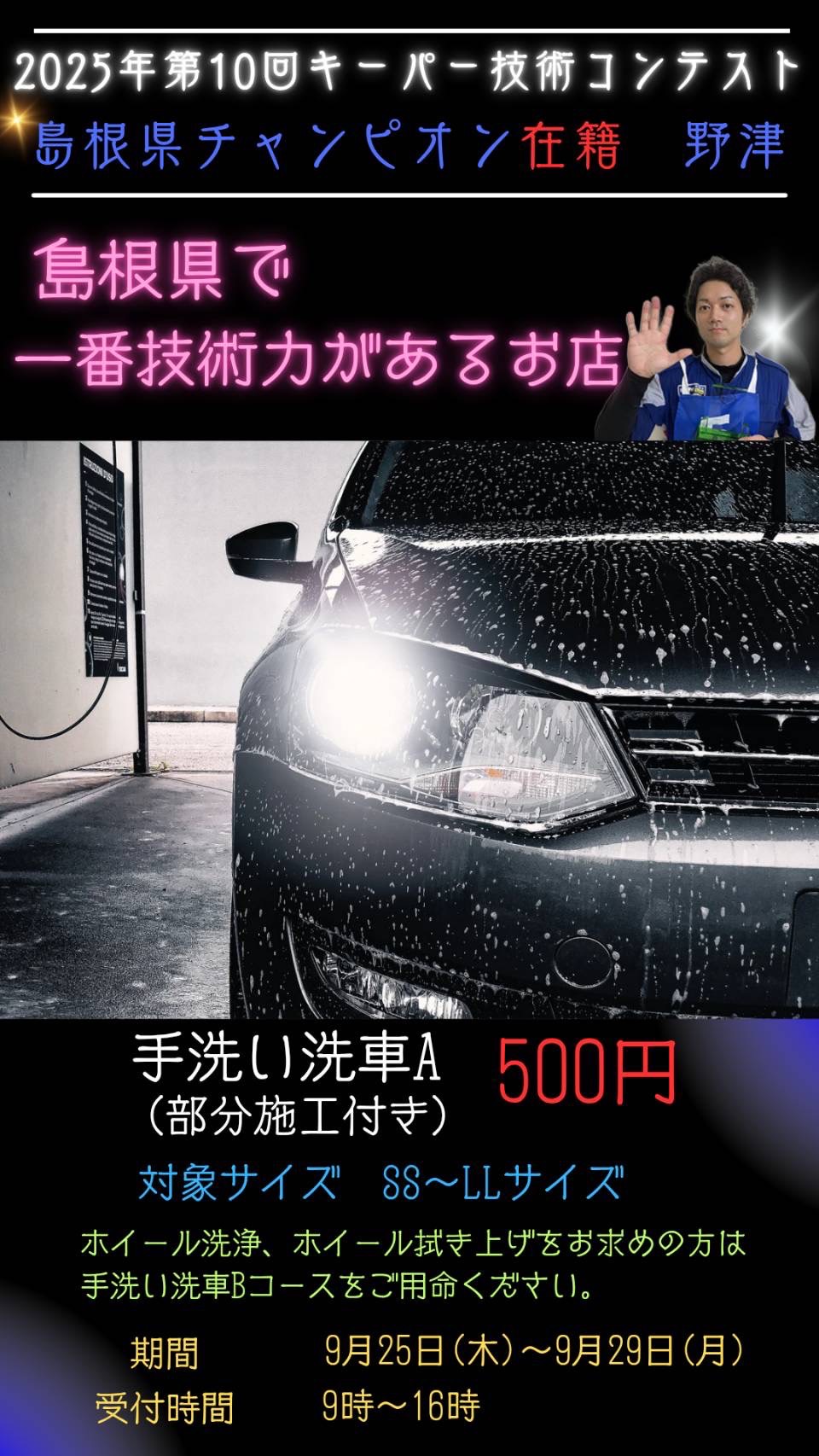 今日は東出雲インターTSで、たくさんの手洗い洗車とコーティング作業を行いました🚗✨秋の曇り空の下、ご来店いただいた皆さまのお車をピカピカに仕上げることができて、とても嬉しい気持ちでいっぱいです😊最近では、9月18日に開催された「2025年第10回キーパー技術コンテスト 島根県チャンピオン決定戦」に出場し、優勝という素晴らしい結果をいただきました!この大会は、洗車やコーティング技術を競うもので、普段から磨いてきた技術が評価されたこと、本当に光栄です。特に当店では「手洗い洗車」や「コーティング」など、お客様の大切なお車を丁寧にケアするサービスが人気です。コーティングは、ボディ表面に特別な被膜を作り、ツヤや汚れにくさが長持ちするので、この季節にもぴったりですよ!そして、日頃の感謝とチャンピオン獲得のお祝いとして、9月25日~29日の期間限定で「手洗い洗車Aコース(SS~LLサイズ)」をなんと500円でご提供するキャンペーンを実施します🎉この機会にぜひ東出雲インターTSへお越しください!※XLサイズは800円/台です。また、これから秋が深まるにつれて雨の日も増えますし、気温差も大きくなってきます。そんな時期だからこそ、お車の定期点検がおすすめです。ワイパーの拭き取り具合やオイル交換、ウォッシャー液の補充はもちろん、タイヤの空気圧や減り具合もしっかりチェックしておくと安心です。ガソリンスタンドならではのサービスで、お客様の安全なドライブをサポートします。今日も最高な気分で仕事ができたことに感謝しつつ、皆さまのお越しをスタッフ一同心よりお待ちしています!秋のお出かけ前にぜひお立ち寄りください🚙💨