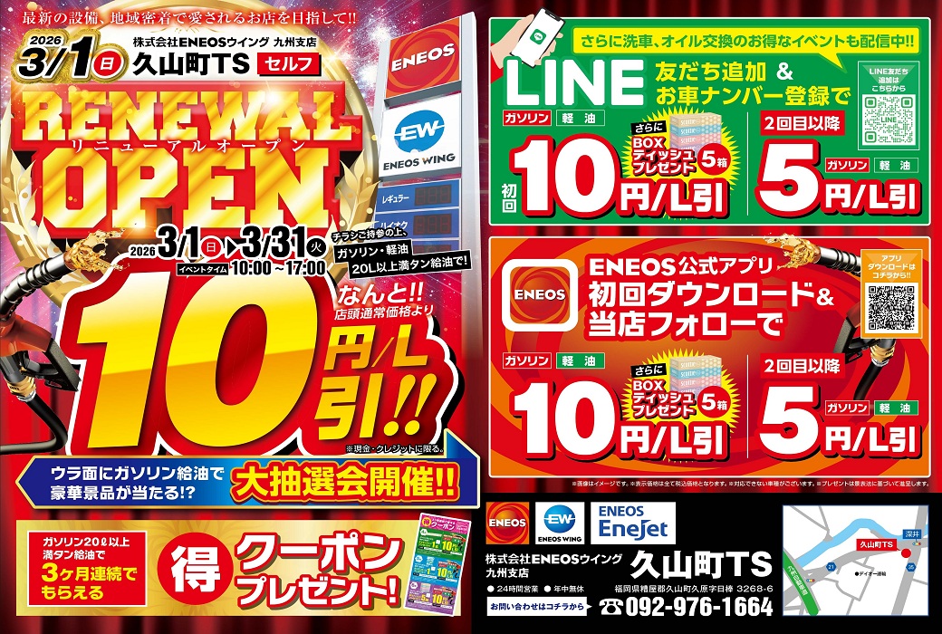 久山町TSは、福岡ICを北に進んだ国道35号と21号の深井交差点の角に位置しています。 ガソリンの給油はもちろん、キズ・ヘコミ修理、点検・整備、車検やコーティングまで車のお困りごと全てに対応可能です。 まずはお気軽にご相談ください。 また、お支払いにおいても現金をはじめ、各種カードでのお支払いも可能となっています。ご予算にあわせてプラン等をご提示させていただきます。 愛車のお困りごとがございましたら、なんでもお任せください!当店のスタッフ一同、お待ちしております!